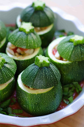 - Fill the large cavities in the courgettes with the corn stuffing and add the tops. Ladle warm tomato sauce on a plate, then place the courgettes on top. Serve immediately.